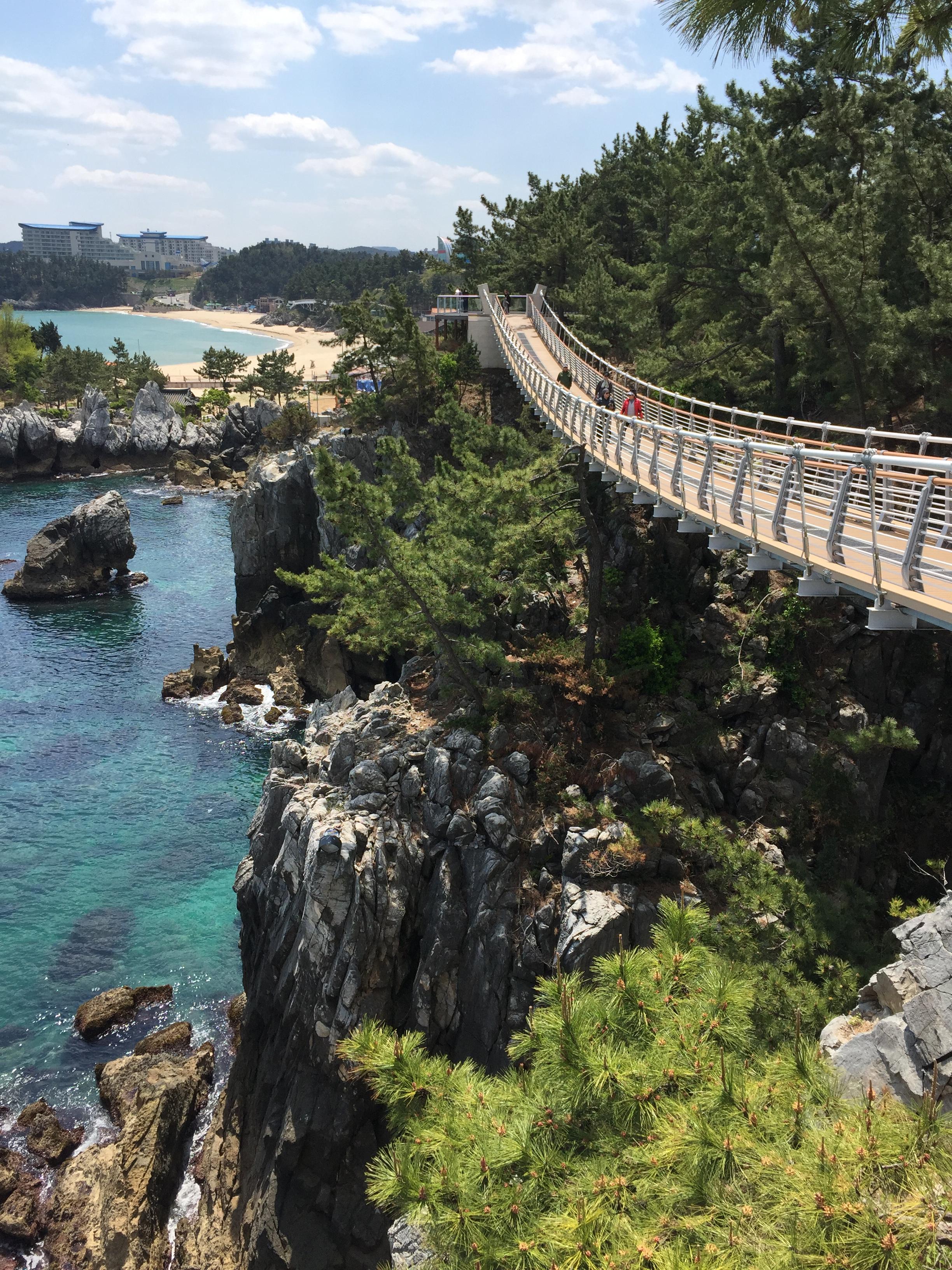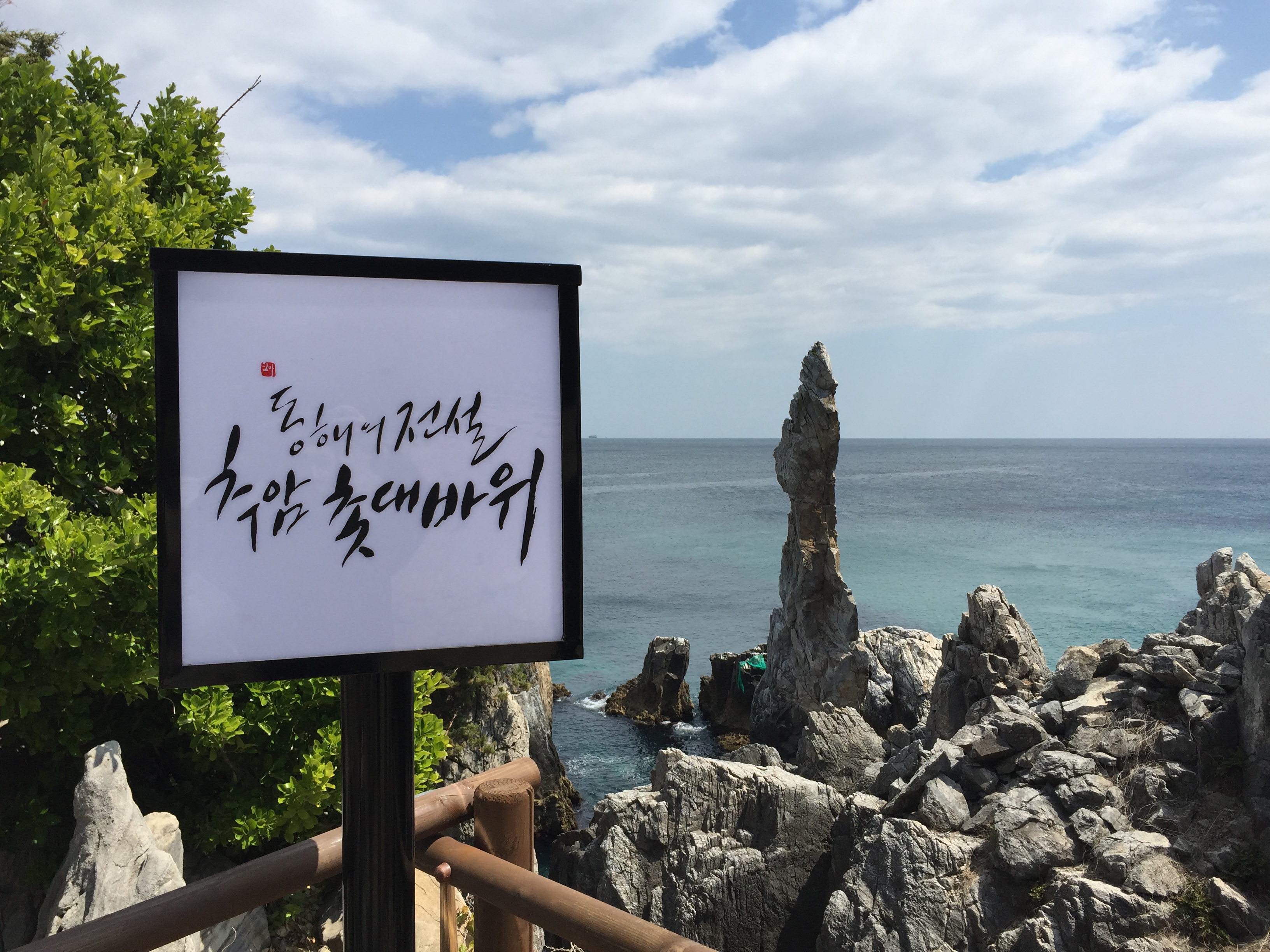추암 촛대바위 출렁다리는 애국가 첫 소절 배경화면으로 등장하는 촛대바위와 수중의 기암괴석이 바다를 배경으로 마치 촛대가 하늘을 향해 우뚝 솟아 있는 듯 한 장관을 연출하며 빚어내는 배경으로 해안 절경과 일출을 동시에 감상하고 즐길 수 있는 장소입니다.