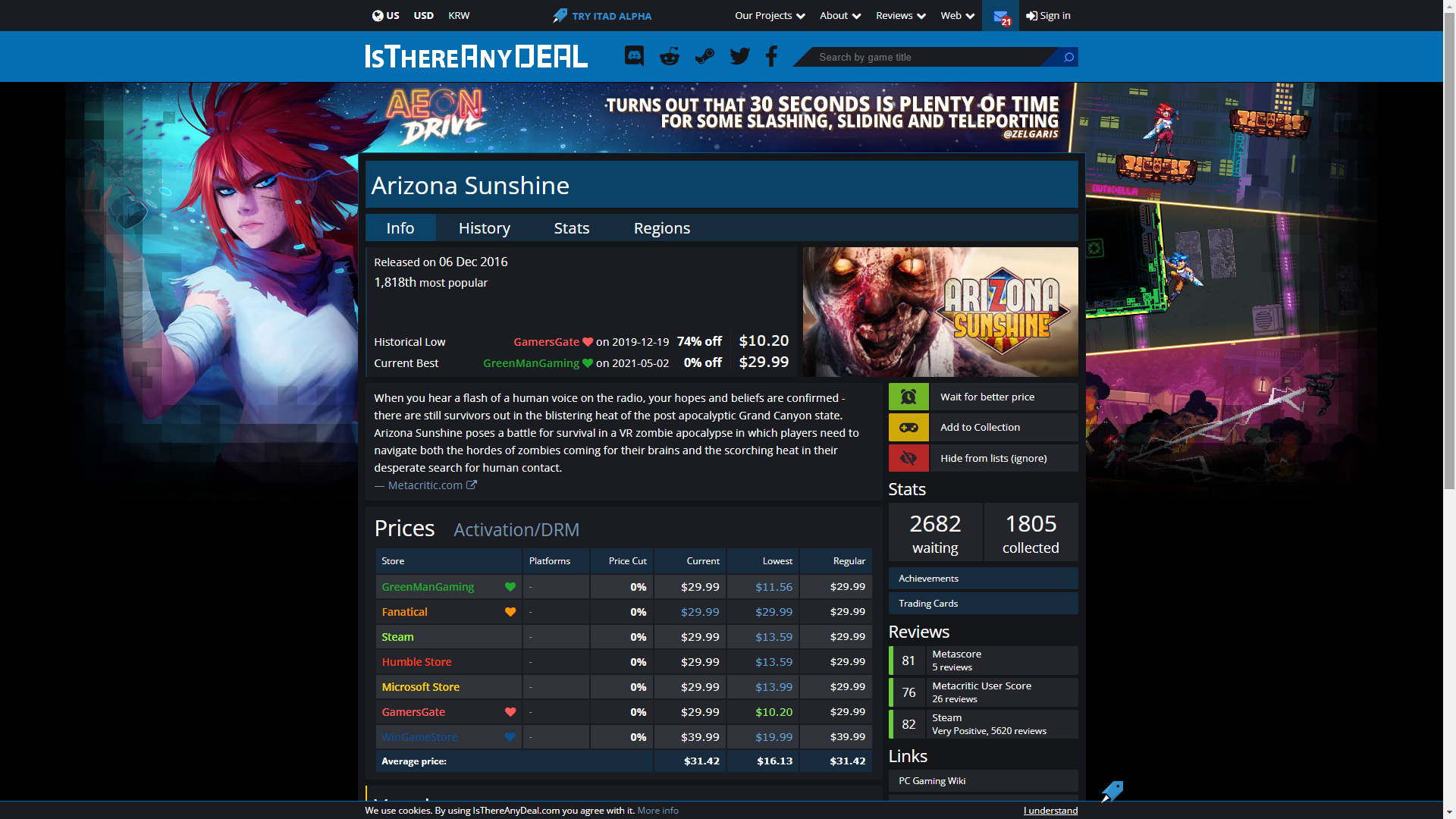 애리조나 선샤인 같은 경우 스팀에서 할인 가장 높을 때, 13.59달러(한화 대략 1만 6천 원)였습니다.