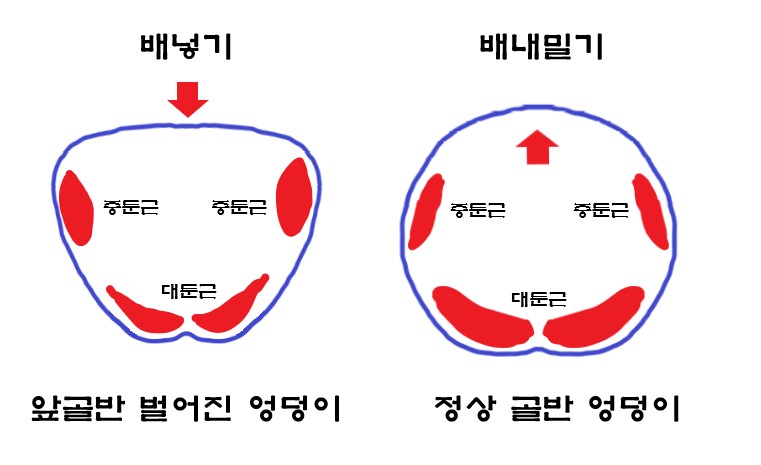 저는 어릴 때 10살 이전부터 똥배라 불리는 아랫배가 나와 보이는 게 싫어서 의식적으로 배를 넣고 다녔습니다. 그 결과 지금은 무의식적으로도 배를 넣게 되어 아래 그림 왼쪽처럼 골반 앞쪽이 벌어졌습니다.