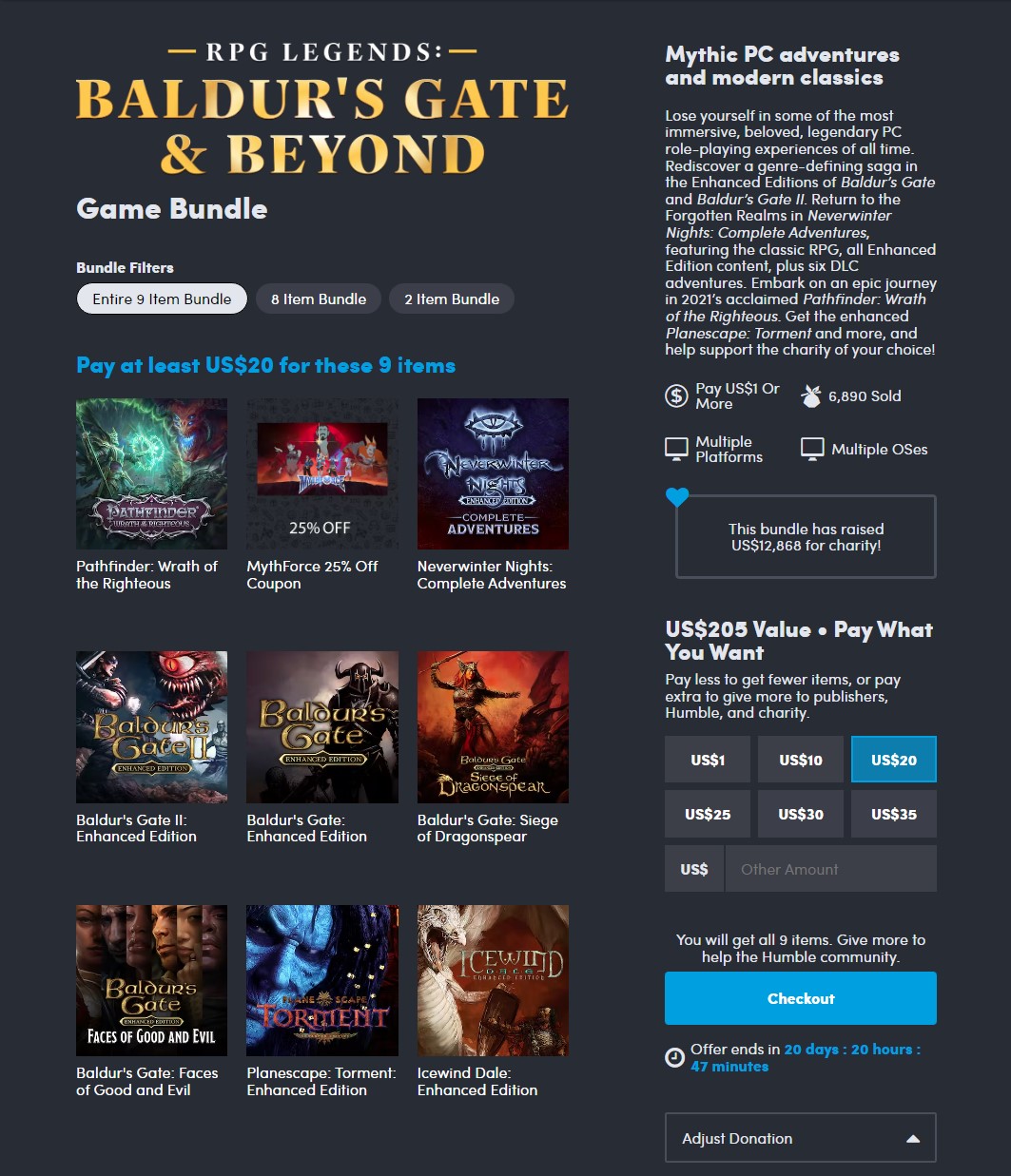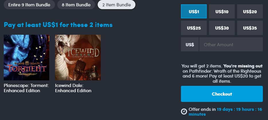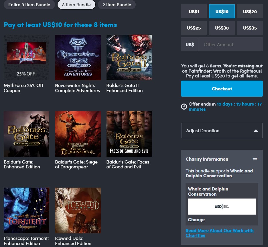 패스파인더:정의의 분노를 제외한 7개의 게임인 네버윈터나이트와 발더스게이트 시리즈 4개, 플레인이스케이프, 아이스윈드데일은 10달러에 구매 가능합니다.